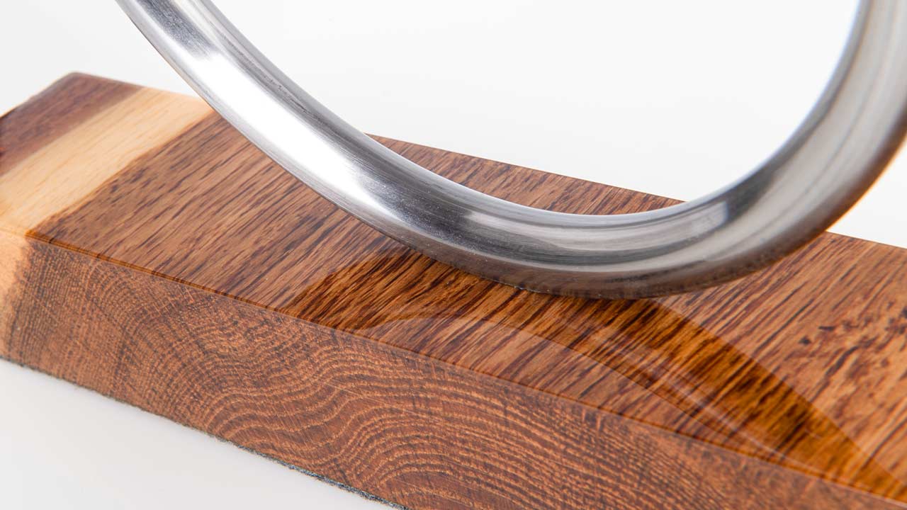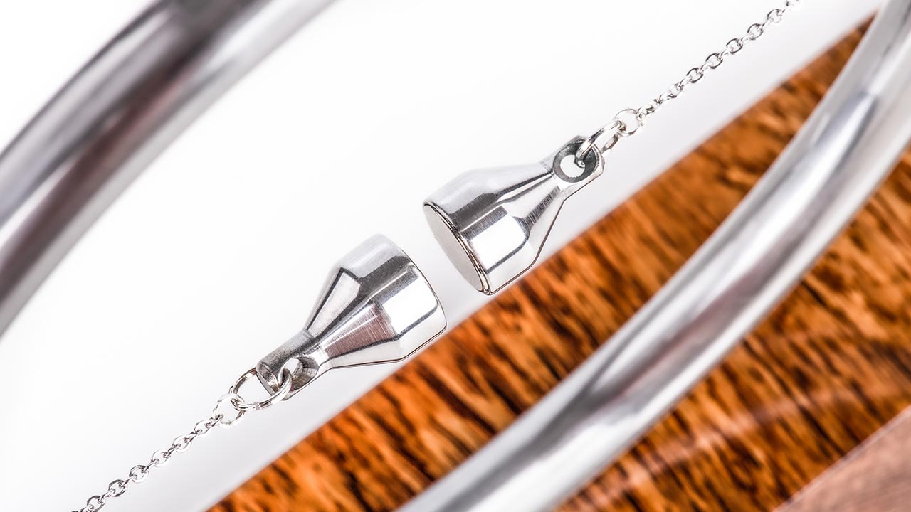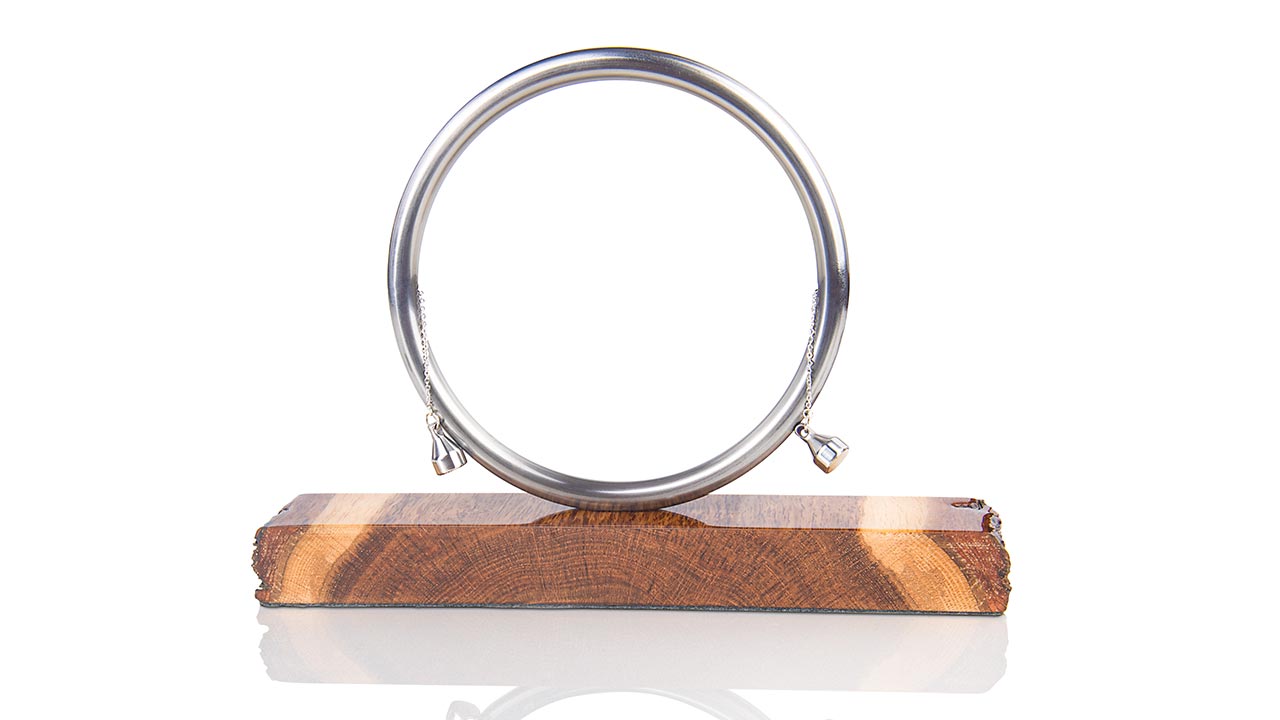 Eine runde Sache – wie eine Umlaufbahn umkreist der polierte Stahlring die zwei im Zentrum liegenden Magnete, welche scheinbar schwerelos den Mittelpunkt und somit den Hingucker dieses Objekts bilden.